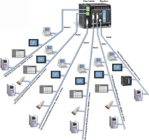永宏P(guān)LC智慧型周邊連線 FBS-PLC之5個通訊埠可同時連結(jié)各種智 慧型周邊,界面則有USB、RS232、RS485、乙太網(wǎng)路可供選 擇,除可接用永宏標準通訊協(xié)定或Modbus通訊協(xié)定,或 透過FATEK通訊 伺服器來通訊外,尚可利用CLINK通訊 便利指令,自行定義protocol主動或被 動地與任何智慧型周邊連線。