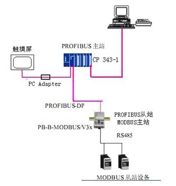 通過PLC CPU上的Profibus DP接口,連接到Profibus轉Modbus協議轉換模塊(PB-B-MM),再連接到兩臺空氣壓縮機以及控制柜上多功能電力監測儀表的Modbus接口,來讀取空氣壓縮機的運行參數和多功能電表的電流電壓功率等電力狀態數據,以及向空壓機發送啟停命令等。